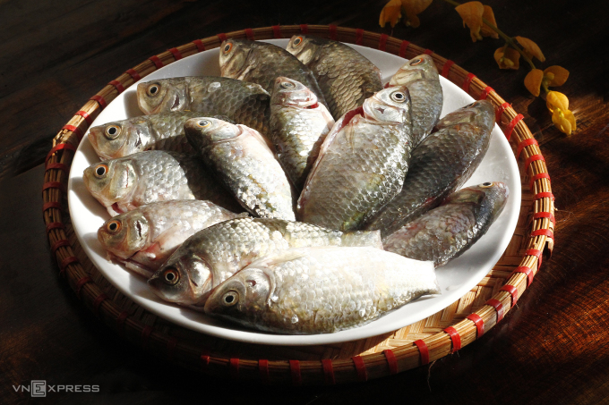 Cá diếc kho bên ngoài màu nâu vàng nhẹ bắt mắt, bên trong thịt cá chắc đậm vị, trứng cá bùi béo. Món này ăn cùng cơm gạo mới tháng 10 âm lịch rất ngon.