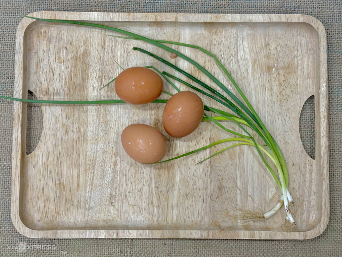 - Đập trứng vào bát tô, thêm 1/3 thìa cà phê muối rồi đánh bông. Hành lá băm nhỏ.